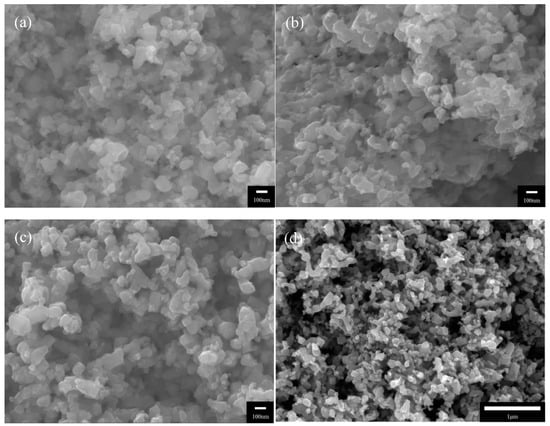 Scanning electron microscopy (SEM) images of the nitrided TiO2 powders and the surface of the coating: (a) TiO2 powder nitrided at 800 °C; (b) TiO2 powder nitrided at 900 °C; (c) TiO2 powder nitrided at 1000 °C; (d) surface morphology of the TiN coating.