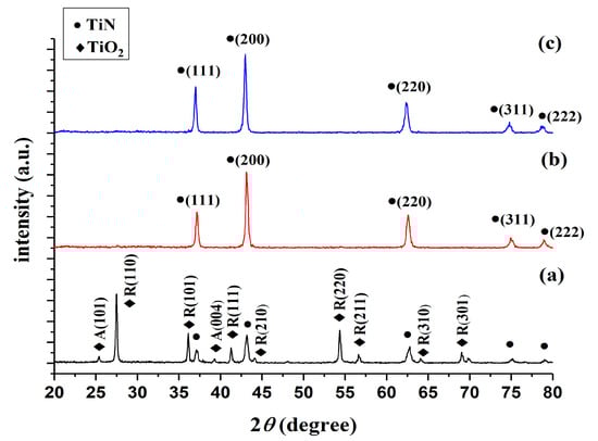 XRD was used to compare the products of TiO2 nitriding at 800, 900, and 1000 °C (henceforth referred to as TiN 800 °C, TiN 900 °C, and TiN 1000 °C, respectively) with the 21-1272, 21-1276, and 38-1420 JCPDS cards [,], in order to validate the chemical composition of these products. Figure 2 illustrates the XRD graphs of the TiN powders formed at different temperatures; the circular markers (●) indicate TiN peaks, whereas the diamond-shaped markers (◆) indicate TiO2 peaks. Figure 2a shows that the TiO2 powders nitrided at 800 °C mainly exhibit the characteristic peaks of TiO2. As the TiN phase is only weakly crystalline in these powders, its characteristics peaks are relatively weak in the XRD graph. Wetchakun and Phanichphant [] have shown that the anatase phase of TiO2 will transform into the rutile phase when TiO2 is subjected to temperatures between 700 and 800 °C; this is consistent with the findings of this experiment. In other words, TiN cannot be fully formed at 800 °C. Dolat et al. [,] observed that the modification of TiO2 at 800 °C in an ammonia atmosphere produces a nitrogen-doped TiO2–TiN composite. Therefore, TiN 800 °C is denoted as TiO2 & TiN 800 °C in this study. Figure 2b shows that TiO2 powders nitrided at 900 °C no longer exhibit TiO2 peaks and only display TiN peaks; hence, we have experimentally demonstrated that TiO2 may be converted into TiN via nitriding at 900 °C. Figure 2c shows that the nitriding of TiO2 at 1000 °C produces the same results as nitriding at 900 °C, as no TiO2 peaks can be observed in this graph. However, as TiN 1000 °C has a greater degree of intensity than TiN 900 °C in the (111) crystal lattice, one may infer that an increase in temperature will promote the growth of crystallinity in the (111) direction. The Scherrer equation was used to calculate the crystal sizes of the (111), (200), and (220) characteristic peaks of TiN 900 and TiN 1000 °C; it was observed that the crystal sizes corresponding to these peaks are 24, 23, and 19 nm in TiN 900 °C, whereas the crystal sizes corresponding to these peaks are 27, 24, and 19 nm in TiN 1000 °C. Hence, an increase in temperature resulted in an increase in the crystal sizes of the (111) and (200) crystal planes. In particular, the (111) crystal plane increased in size by 3 nm, but no significant growth was observed in the (220) plane. These results indicate that the TiN phase cannot be fully formed at nitriding temperatures below 900 °C, whereas TiO2 can be nitrided into TiN at temperatures of 900 °C and above. Furthermore, the strength of the TiN (111) crystal plane will increase with the increase in temperature. Delblanc et al. [] noted that (111)-oriented TiN films display excellent corrosion properties in general, as they have high corrosion potentials and low corrosion current densities. Here, we have determined that the strength of the (111) crystal plane differs in TiN 900 and TiN 1000 °C.