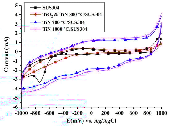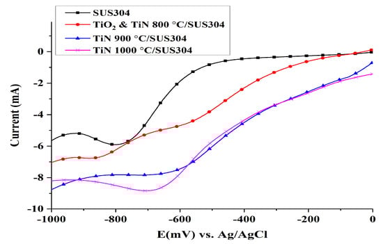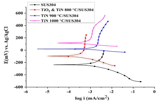 Figure 3 illustrates the Tafel curves of SUS304 with different coatings, whereas Table 3 compares the Tafel properties of SUS304 with different coatings. It is shown that TiN 1000 °C has the highest corrosion potential, followed by TiN 900 °C/SUS304, TiO2 & TiN 800 °C/SUS304, and finally SUS304; the corresponding corrosion potentials are 116.94, 20.016, −96.522, and −233.607 mV, respectively. The corrosion resistance of a material in an environment is proportional to its corrosion potential; hence, TiN 1000 °C/SUS304 has the best corrosion resistance between these electrodes. The corrosion current of TiN 900 °C/SUS304 is the highest of these electrodes, followed by those of SUS304, TiN 1000 °C/SUS304, and finally TiO2 & TiN 800 °C/SUS304; the corresponding currents are 524, 325, 205, and 85.8 nA/cm2, respectively. The corrosion current indicates the rate of corrosion after a material has begun to corrode; the greater the corrosion current, the greater the rate of corrosion. Therefore, TiO2 & TiN 800 °C/SUS304 has the slowest rate of corrosion as it has the lowest corrosion current, and TiN 900 °C/SUS304 has a greater corrosion current than SUS304. Wang et al. [] observed that defects in TiN coatings could induce greater corrosion currents in coated materials than those of the substrate, in addition to galvanic corrosion between the coating and substrate. This further accelerates the substrate solvation and gradually increases the corrosion current densities over time. The coating porosities of TiO2 & TiN 800 °C/SUS304, TiN 900 °C/SUS304, and TiN 1000 °C/SUS304 were calculated using Equation (5), and they were determined to be P 0.1084 × 10−4, P 0.92 × 10−4, and P 0.89 × 10−7, respectively. Thus, the coating porosities of TiO2 & TiN 800 °C/SUS304 and TiN 900 °C/SUS304 are three orders of magnitude greater than that of TiN 1000 °C/SUS304. Valdez et al. [] noted that coating porosity is closely related to the quality of the coating and has a direct impact on the corrosion resistance of the coating. The presence of gaps and pinholes in a coating could reduce its density to levels below that of the substrate, and low porosities could prevent the passage of corrosive solutions into the substrate through the coating, thus weakening local corrosion kinetics.