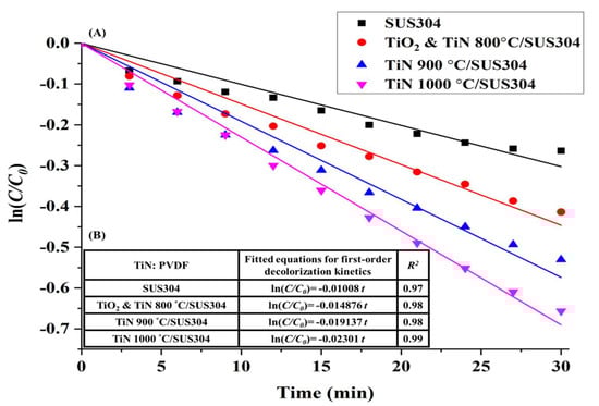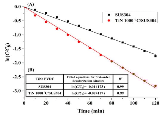 The TiN 1000 °C/SUS304 electrode exhibits first-order decolorization kinetics over 2 h of reaction time, as shown in Figure 8A. The first-order kinetic equations of the decolorization reactions are presented in Figure 8B; as the R2 values are all greater than 0.95, all the electrodes exhibit first-order decolorization kinetics. In particular, the decolorization rate of TiN 1000 °C/SUS304 after 120 min was −0.024117, which is similar to its decolorization rate in Figure 6B. Hence, the TiN 1000 °C/SUS304 electrode is stable in the electrochemical treatment environment throughout the longer experiment. This also proves that the decrease in decolorization rates caused by corrosion of the stainless steel electrode, as mentioned by Rosales et al. [], can be prevented using TiN coatings. The decolorization rates of TiN 1000 °C/SUS304 and SUS304 after 120 min of decolorization are 94.46% and 81.74%, respectively. This demonstrates the superior performance of the TiN 1000 °C-coated SUS304 electrode in the decolorization process.