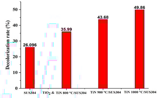 The high electroactive surface areas of TiN/SUS304 electrodes may be explained by the highly porous 3D surface structure of TiN, which is shown in Figure 1d. This structure is also beneficial for achieving high decolorization rates in EF decolorization tests. TiO2 & TiN 800 °C/SUS304 exhibits a relatively small electroactive surface area. This is due to the presence of TiO2 in the TiO2 & TiN 800 °C/SUS304 coating; TiO2 has a lower conductivity than TiN and its presence will interrupt electron transmission pathways, thus reducing the electroactivity in EF system. In summary, TiN 1000 °C/SUS304 and TiN 900 °C/SUS304 have large electrochemically active surface areas, whereas TiN 1000 °C/SUS304 has the largest electrochemically active surface area. Therefore, TiN 1000 °C/SUS304 is the best electrode for EF applications.