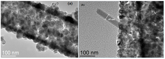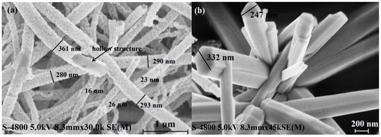 Figure 4 shows the TEM images of electrospun SnO2 nanofibers and SnO2/ZnO 3D hetero-nanofibers. The diameters of SnO2 nanofibers and SnO2 nanoparticles shown in Figure 4a are found to be approximately 250 nm and 25 nm, respectively, which are consistent with the results of the SEM analysis shown in Figure 2a. Figure 4b confirms that the ZnO nanorod is formed on the surface of the electrospun SnO2 nanofiber. Hence, the SnO2/ZnO 3D hetero-nanofibers are synthesized with a hierarchical hollow structure.