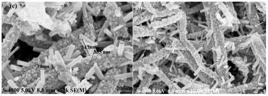 Figure 2 shows the scanning electron microscopy (SEM) images of the as-synthesized SnO2 nanofibers, ZnO nanorods, and SnO2/ZnO nanofibers. Specifically, Figure 2a demonstrates that the prepared electrospun SnO2 nanofibers have a hollow hierarchical structure and each nanofiber is composed of well-arranged small nanoparticles. The SnO2 nanofibers are also relatively uniform with a diameter of around 300 nm. Note that the diameter of SnO2 nanoparticles in the nanofibers is around 22 nm. Figure 2b indicates that the synthesized pure ZnO nanorods are 800~900 nm long and their cross-section has a regular hexagonal shape with a side length of 100~300 nm. In addition, a bundle of ZnO nanorods is grown together to form a flower-like ZnO nanoball [23]. Figure 2c,d display the SEM images of the final SnO2/ZnO nanofibers, where each ZnO nanorod seems to be growing on the surface of a single SnO2 nanoparticle (functioning as a seed material). The size of ZnO nanorods grown on the surface of SnO2 nanofibers have decreased to 300~400 nm long, and they have a hexagonal shape with a side length of 40~80 nm, which is distributed over the surface of the SnO2 nanofibers in a relatively uniform manner. The roots of ZnO nanorods are well attached to the surface of the SnO2 nanofibers. The formed SnO2/ZnO 3D nanocomposite maintains its hierarchical hollow structure.