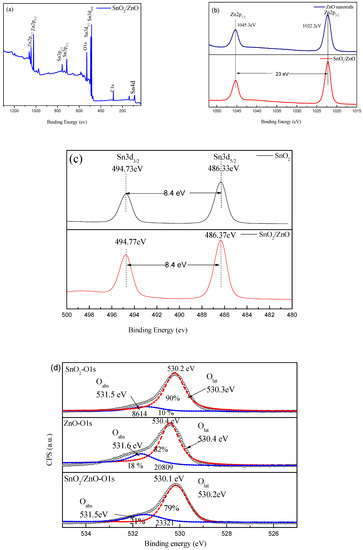 XPS studies were conducted to analyze the composition and chemical states of the elements in the fabricated SnO2/ZnO nanofibers. The binding energy was calibrated internally by the C 1s line position. All the binding energy values were referenced to the C 1s photoemission line at 284.6 eV. Figure 5a shows nine main characteristic peaks of both SnO and ZnO components in the SnO2/ZnO nanofibers, including Zn2p1/2(1045.0), Zn2p3/2(1022.0), Sn3p1/2 (757.0 eV), Sn3p3/2 (715.0 eV), O1s (530.0 eV), Sn3d3/2 (494.0 eV), Sn3d5/2 (486.0 eV), and Sn4d (88.0 eV). The trace amounts of C1s (284.0 eV) may be due to the absorption of organic molecules in the air. The XPS spectra of Sn3d, Zn2p, and O1s determine the surface electronic states of Sn, Zn, and O in the nanocomposite. The binding energy of 23 eV exists between Zn2p1/2 and Zn2p3/2 peaks, and 8.4 eV between Sn3d3/2 and Sn3d5/2, as shown in Figure 5b,c, respectively. In comparison, the XPS spectra of Sn3d of SnO2 and Zn2p of ZnO are measured and shown in Figure 5b,c. The O1s core level XPS spectra of the SnO2, ZnO, and SnO2/ZnO nanofibers are shown in Figure 5d. O1s spectra of SnO2/ZnO is an asymmetric peak at 530.2 eV, which can be separated into two peaks at Olat (530.1 eV) and Oabs (531.5 eV). The Olat peak is attributed to the lattice oxygen on the surface of SnO2/ZnO and the Oabs peak is associated with the adsorbed oxygen of SnO2/ZnO2. The relative intensities of these two factors are 79% and 21%, respectively. We can see that O1s spectra of SnO2 are asymmetric peaks at 530.2 eV, which can be separated into two peaks at Olat (530.3 eV) and Oabs (531.5 eV). The relative intensities of these two factors are 90% and 10%, respectively. The content of adsorbed oxygen (Oabs) of SnO2 is the least of three materials. The O1s asymmetric peaks at 530.2 eV of ZnO nanorods can be separated into two peaks at Olat (530.4 eV) and Oabs (531.6 eV). The relative intensities of these two factors are 82% and 18%, respectively. The content of adsorbed oxygen (Oabs) of ZnO is less than that of SnO2/ZnO2, which can be seen from Figure 5d. The content of absorbed oxygen dominates the adsorption capacity of the nanomaterials, which shows that the adsorption capacity of SnO2/ZnO2 is stronger than that of SnO2 and ZnO.
