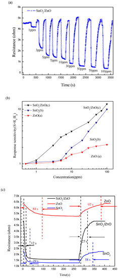 Figure 7a shows the transient responses of the sensor with SnO2/ZnO to different acetone concentrations ranging from 1 ppm to 100 ppm. The resistance change cycles of the SnO2/ZnO sensor were successively recorded. As the acetone concentration increases, the resistance of the sensor decreases. For comparison, Figure 7b includes the responses of the SnO2 and the ZnO counterpart sensors, along with the SnO2/ZnO sensor, as a function of acetone concentration (1~100 ppm). The SnO2/ZnO sensor exhibits the highest response to each concentration, compared to the sensors with SnO2 alone and ZnO alone. More specifically, the sensors with SnO2/ZnO, SnO2, and ZnO have the responses of 1.16, 1.08, and 1.02, respectively, when exposed to 1 ppm acetone; the SnO2/ZnO, SnO2, and ZnO sensors have the responses of 3.08, 1.17, and 1.14, respectively, to 5 ppm acetone; and three sensors have responses of 3.94, 1.98, and 1.48 to 10 ppm acetone, respectively. We can see from measurement dates of low concentration acetone that the SnO2 and ZnO sensors have no response basically to low-concentration acetone, while the SnO2/ZnO sensor has an obvious response to acetone of low concentration. Figure 7c shows that the SnO2/ZnO sensor has a 12-s response time and 27-s recovery time in response to acetone of 5 ppm. The response time and recovery time of the SnO2/ZnO sensor are much faster than those of SnO2 and ZnO sensors to 5 ppm acetone at 375 °C. In this experiment, the response and recovery times presented here are defined as the times required for 10% to reach 90% of the final stable values.