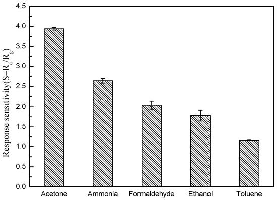 Figure 8 shows the cross-responses of the SnO2/ZnO sensor to different gas species, including acetone, ammonia, formaldehyde, ethanol, and toluene at 10 ppm. The result shows that among the five gas species tested here, the SnO2/ZnO sensor is the most sensitive to acetone (S = Ra/Rg = 3.94 at 10 ppm).