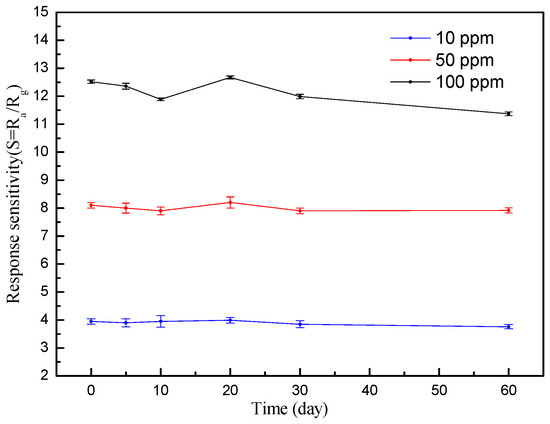Long-term stability and repeatability of the SnO2/ZnO sensor were studied over a two-month period. Figure 9 shows that the SnO2/ZnO sensor exhibits a relative standard deviation of 3.9% from its initial response when exposed to 100 ppm acetone concentration. However, when exposed to the lower gas concentrations of 10 ppm and 50 ppm, the sensor provided almost constant responses over two months with the RSD of 2.1% and 1.5%, respectively [24].