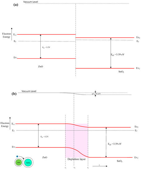 At first, we try to explain using the energy band theory of semiconductors. Both ZnO and SnO2 are n-type, semiconductor-based, gas-sensing materials. Adsorption of oxygen (O2−, O22−, and O2− ions) on the grain surface will result in capturing electrons from the conductance band of the material to form an electron-depleted, space-charge layer in the surface region of the grain [32,33]. The electrons in the conduction band must overcome a potential barrier to move to neighboring grains. The more oxygen ions absorbed on the grain surface, the higher the potential barrier, and thus, the fewer the electrons present in the conduction band. This will increase the surface potential barrier and thus increase the resistance of the sensitive material [34,35]. The band gap and the work function of SnO2 are 3.59 eV and 4.9 eV, respectively, while the band gap and the work function of ZnO are 3.2 eV and 5.2 eV, respectively [36,37,38]. Thus, the Fermi energy level (Ef) of SnO2 is higher than that of ZnO due to the lower work function of SnO2. Furthermore, SnO2 has a higher electron affinity (4.5 eV) than ZnO (4.3 eV); electron transfer will occur from ZnO to SnO2 until the energy band diagram of the n–n heterojunction of SnO2/ZnO come to equilibrium [39]. Because the Fermi energy level is directly related to the number of accumulated electrons, the Fermi energy of SnO2 and ZnO tends to shift to a higher and lower level, respectively. Thus, a new Fermi energy level will be formed in the fabricated SnO2/ZnO heterojunction. Figure 10a,b shows the energy band diagram of the heterojunction before and after equilibrium, respectively. Because electrons and hole transport in the heterojunction lead to energy band bending, and oxygen has a strong electronegativity, the surface activity of the SnO2/ZnO nanofibers becomes high enough to promote oxygen adsorption on the surface of the nanocomposite. The adsorbed oxygen can serve as traps for conduction-band electrons, causing deterioration in electrical conductivity of the SnO2/ZnO nanocomposite. When it meets with the reductive gas species, such as acetone, ethanol, and formaldehyde, it can absorb more oxygen from the surface of the nanocomposite. Thus, the resistance of the nanocomposite (SnO2/ZnO) will decrease due to desorbing oxygen. The more positive surface activity of SnO2/ZnO nanofibers, the smaller the resistance of the SnO2/ZnO sensor, and the greater the response of the SnO2/ZnO sensor [40,41,42].