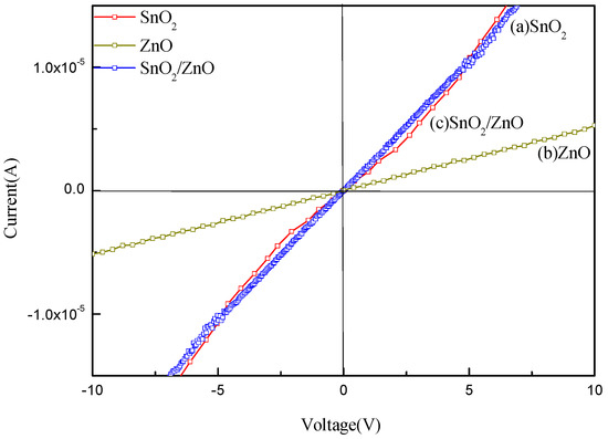 I-V curves of (a) the SnO2, (b) ZnO, and (c) SnO2/ZnO sensors.