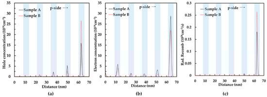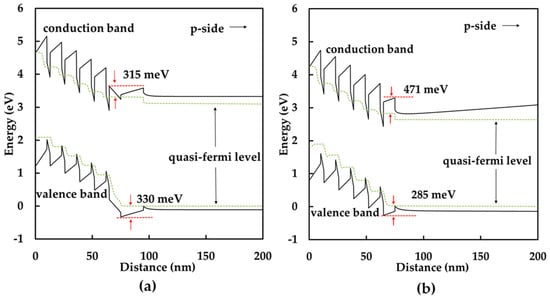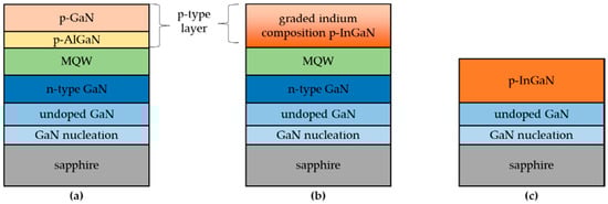 - Wang, C.H.; Ke, C.C.; Lee, C.Y.; Chang, S.P. Hole injection and efficiency droop improvement in InGaN/GaN light-emitting diodes by band-engineered electron blocking layer. Appl. Phys. Lett. 2010, 97, 261103. [Google Scholar] [CrossRef]