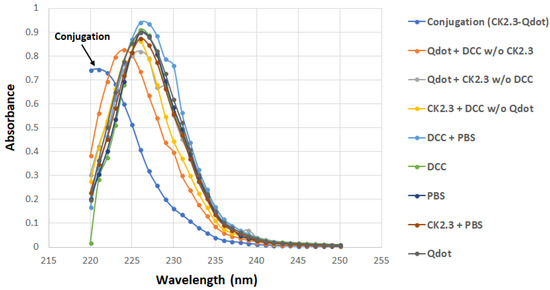 UV/VIS graph representing the absorbance of the CK2.3-Qdot®s fraction, along with the eight other control samples between wavelength 220–250 nm. Conjugated CK2.3-Qdot®s has a distinctive peak compared to its controls, and the absorbance band between 220–225 nm is indicative of secondary amides [45].