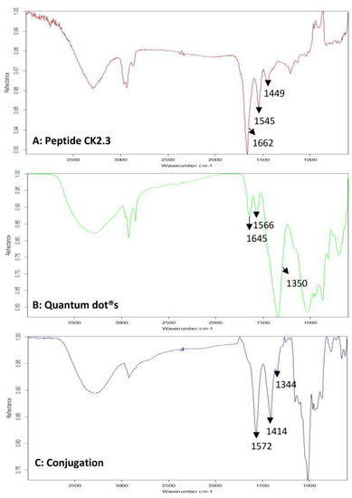 Mid-infrared spectra of samples, drop-casted on gold-coated coverslips were collected using Bruker Optics vertex FTIR spectrometer. FTIR spectra of (A): Peptide CK2.3, (B): Qdot®s, and (C): CK2.3-Qdot®s.