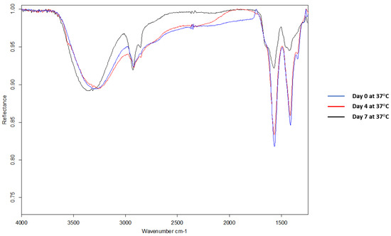Next, FTIR was used to verify the conjugation between CK2.3 and Qdot®s. In the spectra of CK2.3 (Figure 2A), peaks were observed at 1664 cm−1 and 1546 cm−1 which represent amide I bond and amide II bond respectively [46] and ~1430 cm−1 represented the asymmetric bending of proteins [47]. In the case of Qdot®s (Figure 2B), peaks were observed at 1556 cm−1 and 1355 cm−1, which signify the carboxylate (carboxylic acid salt) peaks [48,49]. The peak at 1645 cm−1 represented the OH bending of absorbed water [49]. With respect to the conjugation (Figure 2C), new peaks appeared at 1572 cm−1, 1414 cm−1, and 1344 cm−1. Absorption peaks of amide I and amide II moved to a lower frequency [50,51]. Conjugation moves the amide groups to lower frequency [52] due to resonance effect [53]. Thus, confirming the conjugation between CK2.3 and Qdot®s. Next, we determined the stability of the conjugated CK2.3-Qdot®s at 37 °C (Figure 3) over the course of seven days using FTIR. By comparing the FTIR spectra’s of CK2.3-Qdot®s at day 0 (blue), day 4 (red), and day 7 (black); we noticed that the spectra at day 0 and day 4 were about 94.44% similar, however, at day 7, the amide I and amide II bonds appeared to have a prominent shoulder at 1658 cm−1 and 1466 cm−1; respectively. Presence of a shoulder suggests that some of the CK2.3 are no longer conjugated to Qdot®s and thus, CK2.3-Qdot®s were breaking into their separate components. However, even at day 7 about 44.44% of CK2.3 and Qdot®s are still conjugated.