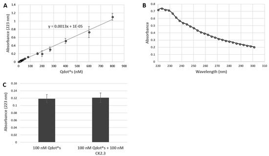 UV/VIS spectra were collected by drop-casting 2 μL of sample onto the pedestal of ND-1000 Spectrophotometer. (A): Standard curve of Qdot®s representing the absorbance of known concentrations of Qdot®s (0–800 nM) at 223 nm; (B): Sample UV/VIS spectra of unconjugated Qdot®s with maximum wavelength at 223 nm; (C): Graphical representation of absorbance at 223 nm by 100 nM of Qdot®s, compared to solution mixture containing 100 nM of Qdot®s and 100 nM of CK2.3.