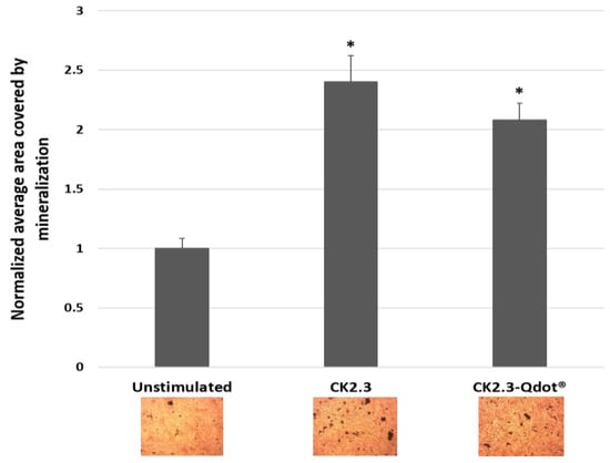 CK2.3 induces significant mineralization at 100 nM in C2C12 cells [16,17], therefore, we confirmed that the conjugated CK2.3-Qdot®s retained their biological activity using von Kossa assay. For this assay, C2C12 cells were either left untreated or treated with 100 nM of CK2.3 and CK2.3-Qdot®s and stained for mineralization using 5% silver nitrate. Von Kossa assay is performed to visualize calcium deposits. The silver ions of the silver nitrate solution, bind to the anions such as phosphates, sulfates, or carbonates of calcium salts and in presence of a strong reducing light such as UV, the silver salts are reduced to form dark brown or black metallic silver staining, which corresponds to calcium deposits [55]. Cells treated with 100 nM of CK2.3 and CK2.3-Qdot®s induced significant mineralization, about 2.4 ± 0.221 and 2.07 ± 143 fold more calcium deposits compared to unstimulated cells; respectively (Figure 5). This result confirmed that the mineralization inducing activity of CK2.3 is retained in the conjugated CK2.3-Qdot®s.