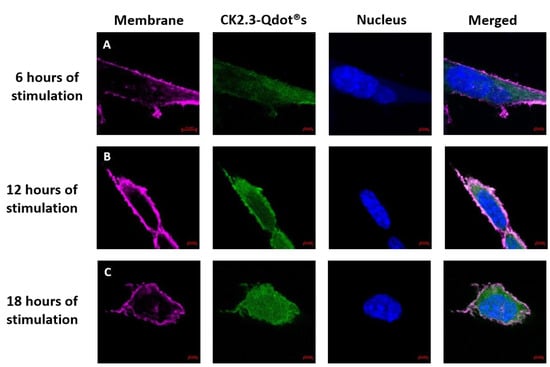 Uptake of CK2.3-Qdot®s (green) by C2C12 cells at 6 h, 12 h, and 18 h. Following stimulation, cells were fixed using 4.4% PFA and the plasma membrane (magenta) and nucleus (blue) of the cells were stained using FM™ 4-64FX and Hoechst; respectively. Images of cells taken using 63×/1.4 objective at (A): 6 h, (B): 12 h, and (C): 18 h show the localization of CK2.3-Qdot®s within the cell.