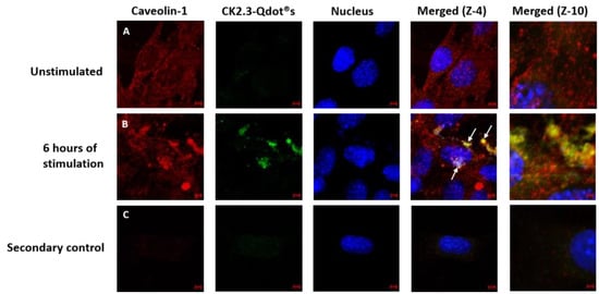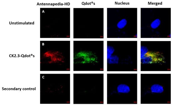 To further verify the conjugation between CK2.3 and Qdot®s, we stained for the Antennapedia homeodomain. The Antennapedia homeodomain signal sequence was incorporated in the peptide sequence of CK2.3. The third α-helix of the Antennapedia homeodomain, a 16-amino acid long peptide, is well known for its ability to translocate across the plasma membrane of a cell in a receptor-independent manner [56,57,58,59]. Cells were either left unstimulated or stimulated with 100 nM of CK2.3-Qdot®s. After fixation, cells were subsequently stained for Antennapedia homeodomain signal sequence and images were collected using confocal microscopy. Results obtained showed that the signals from Qdot®s (green) and CK2.3 (red), co-localized (yellow) (Figure 8B). This data demonstrates, that the size exclusion chromatography completely separates the derivatized Qdot®s from the non-derivatized Qdot®s. It also confirms that CK2.3 is bound to the Qdot®s in the cell. Additionally, as a negative control, unstimulated cells were stained using only the fluorescent secondary antibody to determine their specificity and lack of staining in the cell shows that the antibody is specific against the antigen (Figure 8C).
