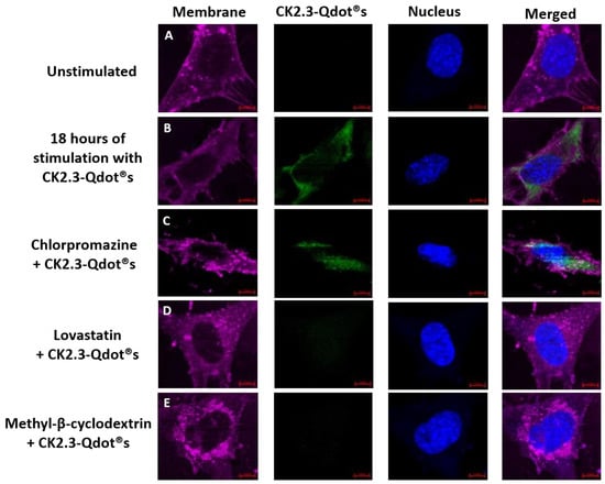 Pharmacological inhibitors were used against endocytic pathways. Chlorpromazine, lovastatin, and methyl-β-cyclodextrin inhibitors were employed to inhibit CCPs-, caveolae-, and both endocytic pathways; respectively. (A): C2C12 cells were either left untreated or (B): treated with 100 nM of CK2.3-Qdot®s for 18 h. Following stimulation, CK2.3-Qdot®s appeared to be internalized within the cell. (C): Treatment of cells with chlorpromazine did not affect the endocytosis of CK2.3-Qdot®s, whereas, (D): treatment of cells with lovastatin and (E): methyl-β-cyclodextrin completely inhibited the internalization of CK2.3-Qdot®s.