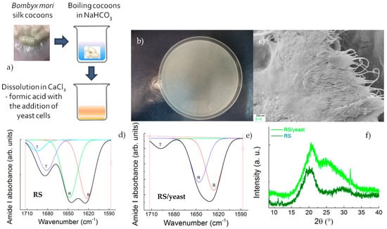 Changes in the structure of the films deposited after the fermentation-assisted silk dissolution were detected by FTIR and XRD. The β-sheet (crystalline) content was determined by the deconvolution of the amide I region (1580–1720 cm−1) and estimating the ratio between the peak area in the wavenumber region of 1622~1637 cm−1, which is the main absorbance region of β-sheet crystal in amide I [21], and the whole area of the amide I region comprising the peaks of the structural components, including turns (T) and random coils (R). The deconvolution of the amide I band provides an estimation of the β-sheet structure in the RS and RS/yeast of 37% and 44%, respectively (Figure 1d,e).