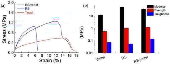 (a) Stress/strain curves from testing of yeast, RS, and RS/yeast samples. The curves represent an analysis performed on three different samples; (b) Effect of yeast fermentation on modulus, strength, and toughness of RS film. The modulus, strength, and toughness of neat yeast film have been reported for comparative purposes.