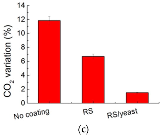 Many fresh fruits have high metabolic activity, and due to microbial attack it results in a short conservation time, colour change (Figure 4b), and off-flavour. The change in colour of fresh fruit, in particular, is associated with ethylene production and cell respiration. To evaluate the exploitation of RS/yeast film as a barrier coating, the change in color of coated and non-coated fresh bananas was evaluated (Figure 4b). Time-lapse photography shows that an RS/yeast coating decreases the fruit degradation when compared to uncoated or RS-coated fruit at day 7. During the continuing metabolism of the fresh fruit, oxygen is transformed into carbon dioxide; thus, gas permeation through a coating film plays a crucial role in fruit storage. To prevent the spoilage of fresh fruits, it is necessary to reduce the breathing process. In our case, the higher beta-sheet content of the RS/yeast film decreases the production of CO2, which indicated a decrease in the respiration rate of the fruits (Figure 4c).