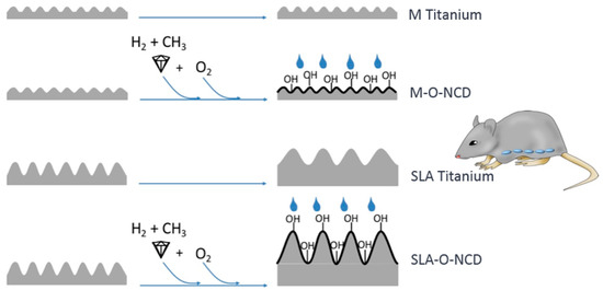 In summary, two groups of M Titanium (uncoated machined titanium surface (M Titanium), and machined NCD-coated hydrophilic titanium surface (M-O-NCD)) and two groups with an SLA surface topography (uncoated SLA titanium (SLA Titanium), SLA and NCD coated hydrophilic titanium (SLA-O-NCD)) were used for the present investigation.