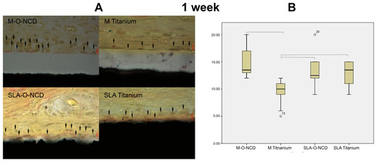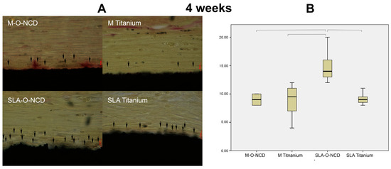 At 4 weeks of healing, the Kruskal Wallis test revealed significant differences among the groups (p = 0.007), and the post hoc test yielded significantly higher cell counts for SLA-O-NCD surfaces (15.0 ± 3.16 cells/ROI), compared with SLA Titanium (9.13 ± 0.99 cells/ROI, p < 0.014), M-O-NCD (8.87 ± 2.75 cells/ROI, p < 0.018), and M Titanium (8.8 ± 2.75 cells/ROI, p < 0.027).