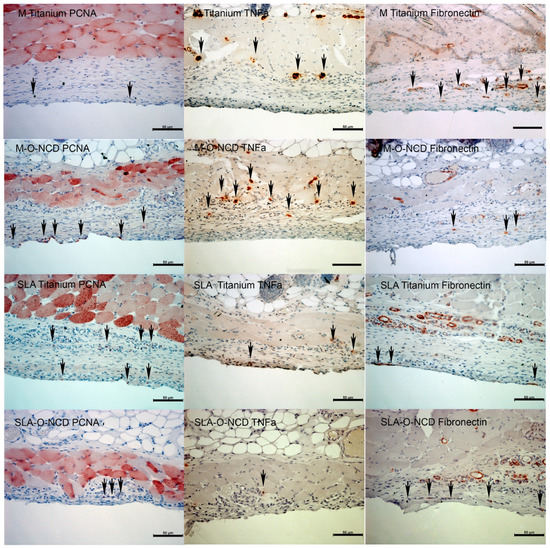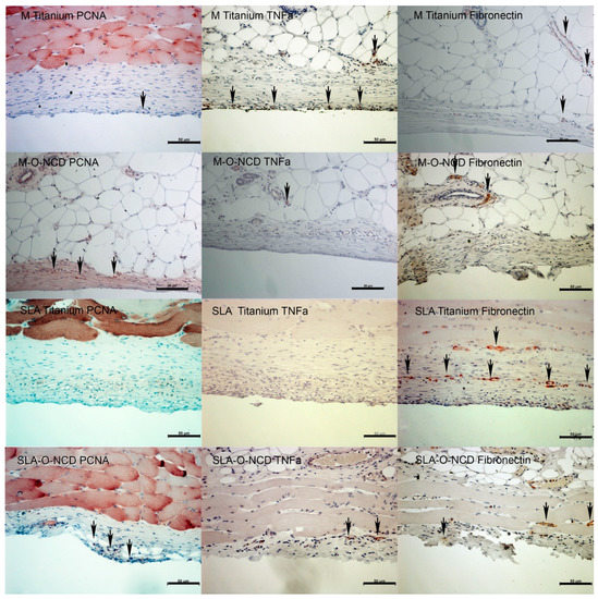 Figure 4). Surfaces close to expression sites of TNFa were located at the soft tissue: the SLA Titanium interface. TNFa activity was also found in deeper layers in M-O-NCD and M Titanium samples. Fibronectin appeared to be increased on all SLA surfaces.