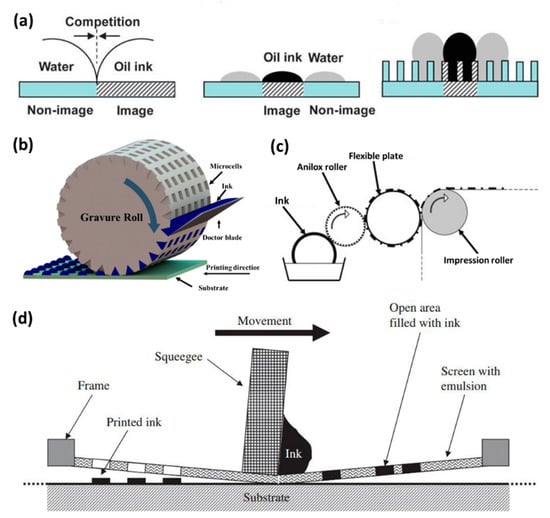 (a) The scheme is the role of plate for controlling ink patterning in offset printing technique. The hydrophilic area is the non-image area, and the other area is the image area. The effect of surface energy and surface structure on the wetting behavior of oil ink and water are exhibited. The water is on the hydrophilic and non-image area which could repel the oil ink. The plate is the chemically patterned flat plate. The plate is the chemically and structured patterned plate. Reproduced from [33], with permission from Royal Society of Chemistry, 2013; (b) The processing steps of gravure printing: ink filling in the microcells, the doctor blade wiping the ink, ink transferring to the substrate, the functional material patterning formation. Reproduced from [35], with permission from American Chemical Society, 2014; (c) The processing steps of flexographic printing: ink transferring to the anilox roller, ink transferring to the flexible plate, ink transferring to the substrate with the impression roller; (d) The processing steps of screen printing. The ink is squeezed through the pores from the mesh plate with the auto device, and then the functional ink is deposited onto the required area of printing substrate. Reproduced from [40], with permission from Elsevier, 2009.