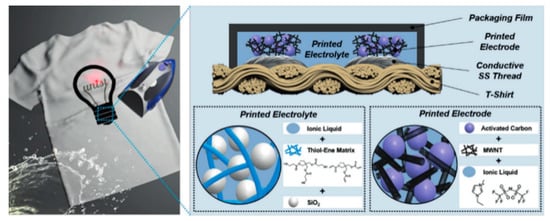 - Lee, S.S.; Choi, K.H.; Kim, S.H.; Lee, S.Y. Wearable supercapacitors printed on garments. Adv. Funct. Mater. 2018, 28, 1705571. [Google Scholar] [CrossRef]