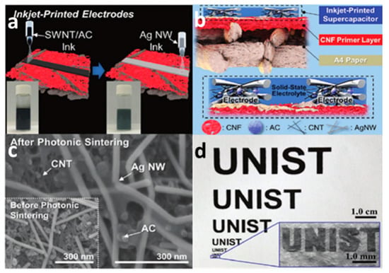 Schematic diagram of inkjet printing a supercapacitor with active carbon composite ink; (a) Prepare supercapacitors by inkjet printing AC/SWNT inks and Ag inks, respectively; (b) Inkjet printing AC/SWNT electrode structure; (c) Scanning electron microscope (SEM) images of inkjet printed AC/SWNT electrode; (d) Inkjet printed electrode with the shape of UNIST on A4 paper. Reproduced from [55], with permission from Royal Society of Chemistry, 2016.