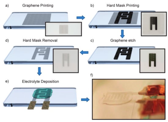 A schematic of a transparent type supercapacitor prepared by inkjet printing graphene ink. (a) Printing of graphene ink on a substrate; (b) Screen printing of silver ink as a current collector; (c) Plasma etching; (d) Removal of a mask; (e) Dripping the gel electrolyte; (f) Photographs of printed supercapacitors. Reproduced from [58], with permission from Royal Society of Chemistry, 2017.