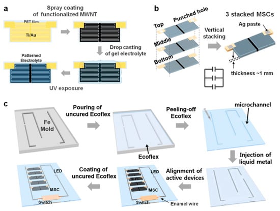 - Kim, H.J.; Yoon, J.Y.; Lee, G.B.; Paik, S.H.; Choi, G.W.; Kim, D.; Kim, B.M.; Zi, G.S.; Ha, J.S. Encapsulated, High-Performance, Stretchable array of stacked planar micro-supercapacitors as waterproof wearable energy storage devices. ACS Appl. Mater. Interfaces 2016, 8, 16016–16025. [Google Scholar] [CrossRef] [PubMed]