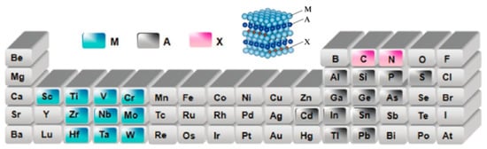 Transition metal carbides/carbonitrides or nitrides (MXenes) are new members of the 2D material world. The material is typically produced by selectively etching the A layer from its MAX layer counterpart, which is a layered ternary carbide or a nitride with a formulation denoted as Mn+1AXn (n = 1–3), where M represents an early transition metal (such as Sc, Ti, Zr, V, Nb, Cr, or Mo), A is generally from the group IIIA or IVA (i.e., Group 13 or 14), and X is carbon and/or nitrogen. In 2011, Y. Gogotsi and his colleagues firstly reported the use of hydrofluoric acid (HF) for Al etching of Ti3AlC2 to produce graphene-like Ti3C2 MXene [66]. In this process, the surface of the Ti3C2 monolayer chemically terminates at O, OH, and/or F atoms. Following similar experimental procedures, the scientists designed the MXenes family, including Ti2C, Nb2C, Ti3CN, and so on, by using a corresponding MAX phase stripping of chemicals such as hydrofluoric acid, ammonium difluoride (NH4HF2), and so on [67]. There are two forms of MXenes with different M: solid solutions and ordered phases. In a solid solution, random arrangements of two different transition metals are observed in the M layer. In contrast, in the ordered phase, a single or double layer of a transition metal is sandwiched between layers of the second transition metal in the 2D carbide structure [68]. The researchers demonstrate that ordered MXenes are more energy-stable than solid solutions through computational density functional theory (DFT) for certain combinations of transition metals [69]. Presumably the possible constituent atoms of MAX are shown in Figure 11 [70]. It is predicted that there are more than 25 different MXenes.