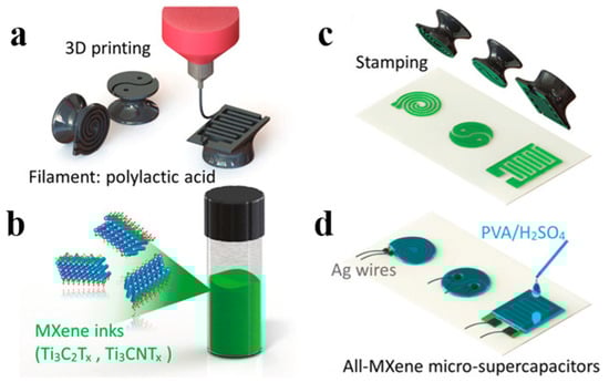 Fabricating the all-MXene micro supercapacitors with imprinting technique. (a) 3D printing process to create different shapes of seals; (b) Mxene inks; (c) Imprinting process; (d) All-Mxene micro supercapacitors. Reproduced from [77], with permission from Wiley, 2018.