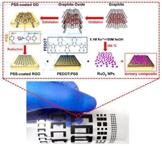 - Cho, S.; Kim, M.; Jang, J. Screen-printable and flexible RuO2 nanoparticle-decorated PEDOT:PSS/Graphene nanocomposite with enhanced electrical and electrochemical performances for high-capacity supercapacitor. ACS Appl. Mater. Interfaces 2015, 7, 10213–10227. [Google Scholar] [CrossRef] [PubMed]