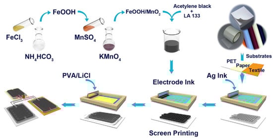 - Lu, Q.; Liu, L.; Yang, S.L.; Liu, J.; Tian, Q.Y.; Yao, W.J.; Xue, Q.W.; Li, M.X.; Wu, W. Facile synthesis of amorphous FeOOH/MnO2, composites as screen-printed electrode materials for all-printed solid-state flexible supercapacitors. J. Power Sources 2017, 361, 31–38. [Google Scholar] [CrossRef]