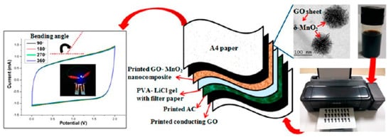 In recent years, cheaper and more environmentally friendly metal oxide electrode materials have received more and more attention from researchers, such as MnO2, NiO, V2O5, and Fe3O4. Among them, MnO2 was the most interesting metal oxide material due to its relatively low cost, low toxicity, environmental friendliness, and high theoretical capacity (1100–1300 F g−1). MnO2 is less expensive than noble metal oxides (RuO2, etc.), and it is one of the most valuable active materials with environmental friendliness and high theoretical specific capacitance (1370 F/g−1). In general, the conductivity of MnO2 (10−5–10−6 S/m) is very poor [97], which has become a major obstacle in the field of energy storage. In order to improve its conductivity, an effective method is compositing MnO2 with other conductive materials which act both as a current collector of the electrode and as a carrier of the MnO2. The energy storage mechanism of MnO2 is based on the adsorption and protonation of cations ion C+ (such as Na+, K+, etc.) in the electrolyte as the electrode material, and then a reversible oxidation–reduction reaction occurs to store the charge. As shown in Figure 17, Q. Lu et al. constructed an all-solid-state supercapacitor using MnO2/FeOOH by means of full screen printing technology, it exhibited a large specific capacitance (350.2 F g−1 at 0.5 A g−1), good rate capability (159.5 F g−1 at 20 A g−1), and outstanding cycling stability (95.6% capacitance retention after 10,000 cycles) [98]. In addition, P. Sundriyal et al. inkjet printed a solid state supercapacitor using MnO2 ink and a desktop printer, which had a high area capacitance of 1.586 F cm2 and a high specific capacitance of 1023 F g−1 (Figure 18) [99].