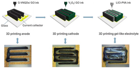 Schematic of a 3D printed micro supercapacitor. The GO composite ink was first printed as an electrode, then PVA/LiCl electrolyte was printed, and a full-printed supercapacitor was prepared. Reproduced from [107], with permission from Wiley, 2018.
