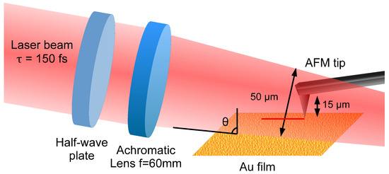 A scheme of the experimental setup is shown in Figure 1. The laser source for the experiments was a home-built femtosecond Ytterbium-doped fiber laser oscillator, designed according to [31]. The output of the laser cavity was directed to a pair of diffraction gratings that compensate the dispersion and compress the laser pulse. The laser beam consisted of laser pulses with temporal length = 150 fs, 1 nJ energy per pulse, central wavelength = 1040 nm, 46 MHz repetition rate, and linear polarization. The polarization was controlled by a half-wave plate. The laser power was adjusted by a combination of another half-wave plate and a polarizing beamsplitter cube. After passing through a periscope, the laser beam was focused onto the SPM tip by an achromatic lens (AC254-060-B-ML, Thorlabs, Newton, NJ, USA) with a focal length f = 60 mm. The laser spot diameter at the focal plane was 50 m and the angle of incidence = 88 with respect to the tip axis. Under this condition, the tip with a height of ca. 15 m was entirely irradiated. The laser peak intensity was adjusted during the experiments from a minimum of I = 0.15 × 10 W/cm to a maximum value of I = 2.90 × 10 W/cm.