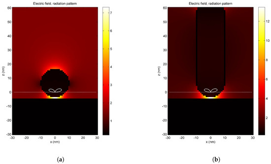 - Esteban, R.; Vogelgesang, R.; Kern, K. Simulation of optical near and far fields of dielectric apertureless scanning probes. Nanotechnology 2006, 17, 475–482. [Google Scholar] [CrossRef]