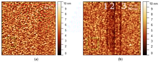 To analyze the influence of the angle of incidence, a similar experiment was conducted on a 30 nm thick gold film on glass at = 80. Far-field surface modifications similar to Figure 3b were observed (not shown here), even for a lower number of pulses N = 0.19 × 10. Therefore, we inferred that the angle of incidence has a drastic effect on far-field surface modifications, more significant than the number of pulses. In order to produce near-field nanolithography, far-field surface modifications need to be avoided. Therefore, the laser intensity was decreased by changing the angle of incidence to = 88. At this angle of incidence, no far-field surface modifications were observed, even for a high number of pulses N = 4.2 × 10. Figure 4a shows the surface of the sample (30 nm thick gold film on glass) before laser irradiation. Similar gold grain patterns can be observed before and after laser irradiation (e.g., green boxes in Figure 4a,b). This indicates that the far-field laser did not affect the surface morphology and only the areas below the tip were modified during irradiation.