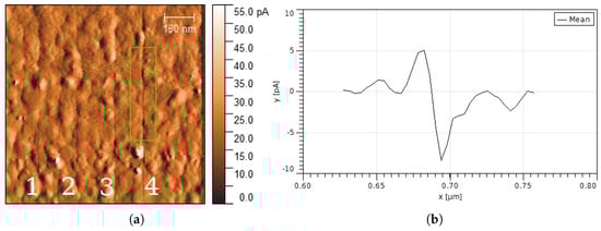 Nanolithography depending on laser intensity. Gold on mica (30 nm thickness) (a) after laser irradiation at four vertical lines (slow axis scanning from left to right stopped). I = 0.2, 0.3, 0.4, 1.0 × 10 W/cm, angle of incidence = 88, scanning speed 0.38 m/s; (b) averaged line profile of the area marked in Figure 5a. The FWHM width of the line is 10 nm. The image was obtained in AFM contact error mode, where a constant force is applied to the tip and the variations of the cantilever’s deflection are recorded.