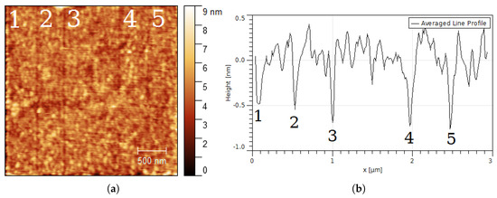 Laser intensity dependence was also studied on a 30 nm thick gold film on glass. Figure 6a shows five vertical lines irradiated at increasing laser power I = 0.7, 1.0, 2.0, 2.7 and 2.9 × 10 W/cm (from left to right) and scanning speed of 0.38 m/s. The profile line was averaged (taking the full area in Figure 6a), to reduce the effect of the gold roughness. The FWHM width and depth of lines (Figure 6b) increased with the laser intensity (Table 2). The writing performance at lines 1, 4 and 5 was affected by 1–3 nm height irregularities of the gold surface.