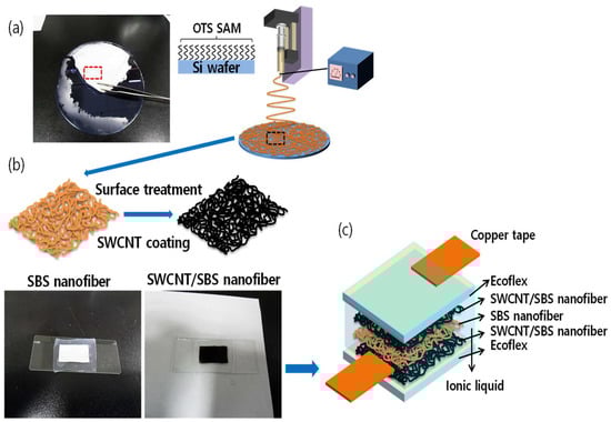 A SWCNT (Hanwha Nanotech Corp., Seoul, Korea, ASP-100F, 90%, length 10–20 μm, diameter 10–20 nm, 100 S/cm) ink solution was prepared by dispersing 10 mg of as-purchased SWCNTs with 5 mg of sodium dodecylbenzene sulfonate (SDBS, Aldrich Inc., St. Louis, MO, USA) in 10 mL of deionized (DI) water using a probe-type sonicator (950 W, Ningbo SCIENTZ Biotechnology Corp., Zhejiang, China) for 2 h. UV/ozone (UVO) surface treatment, polydopamine coating, and fluorinated surfactant (Aldrich Inc., St. Louis, MO, USA, Zonyl FS-300) treatment were carried out to make the SBS nanofibrous mats hydrophilic. For the UVO treatment, SBS nanofibrous mats were placed in a UVO chamber (Novasan Inc., Boone, IA, USA, Jelight 144AX) for 15 min. For the polydopamine coating, the SBS nanofibrous mats were dipped in the dopamine (Aldrich) solution (2 mg/mL of dopamine dissolved in 10 mM Tris-HCl (Aldrich Inc., St. Louis, MO, USA, pH 8.5)) for 12 h at room temperature. The color of the SBS nanofibrous mats changed from white to dark brown, indicating the formation of polydopamine on the nanofiber surfaces. Lastly, for the fluorinated surfactant treatment, 0.1 wt.% of Zonyl FS-300 (Aldrich Inc., St. Louis, MO, USA) was applied to the SBS nanofiber mat. Then, the SBS nanofibrous mat was simply dipped into SWCNT/SDBS solution for 3 min, gently washed with DI water several times, and vacuum dried at room temperature.