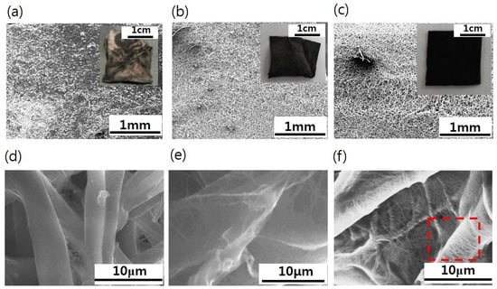 Field-emission scanning electron micrographs (FESEM) of the SWCNT/SBS nanofiber mats following different surface treatments: (a,d) UVO treatment; (b,e) Polydopamine treatment; (c,f) Zonyl treatment. The insets in (a–c) show photographs of the SWCNT/SBS nanofiber mats. The red dotted box in (f) clearly shows the densely coated SWCNT on SBS nanofiber.