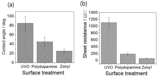 (a) Contact angle of the water droplet on the SBS nanofiber film after different surface treatments (UVO, Polydopamine, Zonyl); (b) Sheet resistance following three different surface treatments.