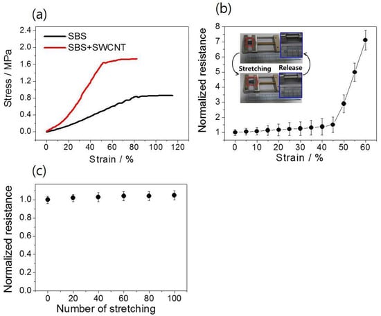 For the best sample (Zonyl-treated SWCNT/SBS), the mechanical property of the nanofiber film was measured using a uniaxial tensile test (Figure 4a). For the SBS nanofiber film, the Young’s modulus was measured to be ~0.94 MPa. On the other hand, the Young’s modulus of SWCNT-coated SBS nanofiber film was ~4.22 MPa, indicating a much rigid film after SWCNT coating. For both cases, there were strain values at which Young’s modulus suddenly changed; these were ~45% and ~80% of the strain for SBS and SWCNT/SBS, respectively. After these points, the nanofiber films undergo irreversible deformation, thus suggesting the maximum tolerable strain for each case. Figure 4b presents the normalized resistance (η = R/Ro, where Ro and R refer to the sheet resistance of SWCNT/SBS sheet before and after stretching, respectively) as a function of the applied strain. For a stretched SWCNT/SBS, the normalized resistance with respect to the unstretched state remained almost invariant up to ~45% strain, which coincides with our previous tensile test. Beyond this threshold value, the resistance increased radically, implying a breaking of most of the percolation network between the SWCNT. This point is higher than those (~30%) reported in the literature, where a buckled substrate was utilized in stretching experiments [18,25].