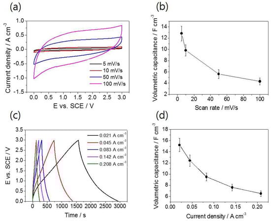 Prior to the measurement at stretched state, we first evaluated the electrochemical performances of our supercapacitor with a two-electrode configuration in the absence of stretching. Figure 5a displays the CV curves of the devices at scan rates from 0.005 V s−1 to 0.1 V s−1. All the curves showed the symmetrical and rectangular shape irrespective of the scan rate, indicating that ions diffuse/accumulate effectively in the porous stretchable electrode. The calculated volumetric capacitances were 12.8, 9.8, 5.6, and 4.3 F cm−3 at scan rates of 0.005, 0.01, 0.05, and 0.1 V s−1 (Figure 5b). Figure 5c shows the GCD curves within a potential window of 3.0 V at current density from 0.021 A cm−3 to 0.208 A cm−3. Slight deviation from the linear relationship between potential and time was acquired at different current densities (Figure 5c). This behavior is often observed in the symmetric supercapacitors rather than asymmetric counterparts [45,46]; it is reported to be because of the higher internal resistance in symmetric supercapacitors [45,47]. The high IR drop observed in our symmetric device could explain this non-linear behavior. The volumetric capacitance (calculated from the discharge time after IR drop at each current density) varied from 15.2 F cm−3 to 6.5 F cm−3 within the current densities applied above (Figure 5d).