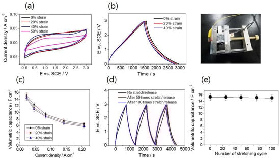 Electrochemical performance of the supercapacitors upon stretching. (a) Cyclic voltammograms for devices under 0%, 20%, and 40%, and 50% strain; (b) Galvanostatic charge/discharge curves for a devices under 0%, 20%, and 40% strain; and on the right, a photograph taken during a stretching experiment; (c) Volumetric capacitance as a function of discharge current density for devices under 0%, 20%, and 40% strain; (d) Galvanostatic charge/discharge curves at a current density of 0.045 A cm−3 following 0, 50, and 100 times of repeated stretch/release cycles at 40% strain; (e) Variation of volumetric capacitance after the different number (0, 25, 75, and 100) of stretch/release cycles.
